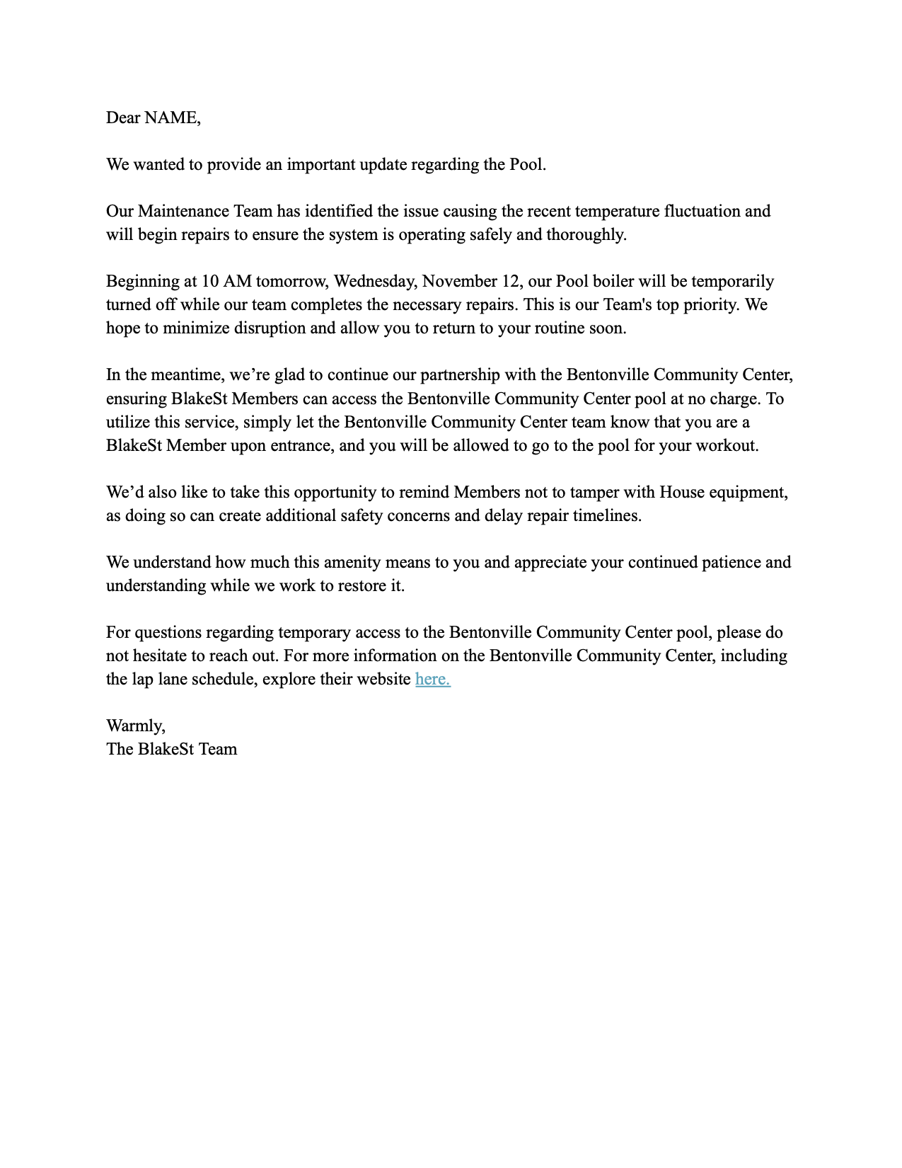 Proactively inform Members of a temporary pool closure due to maintenance repairs, while minimizing disruption, setting clear expectations, and maintaining trust through transparent and solution-oriented communication.