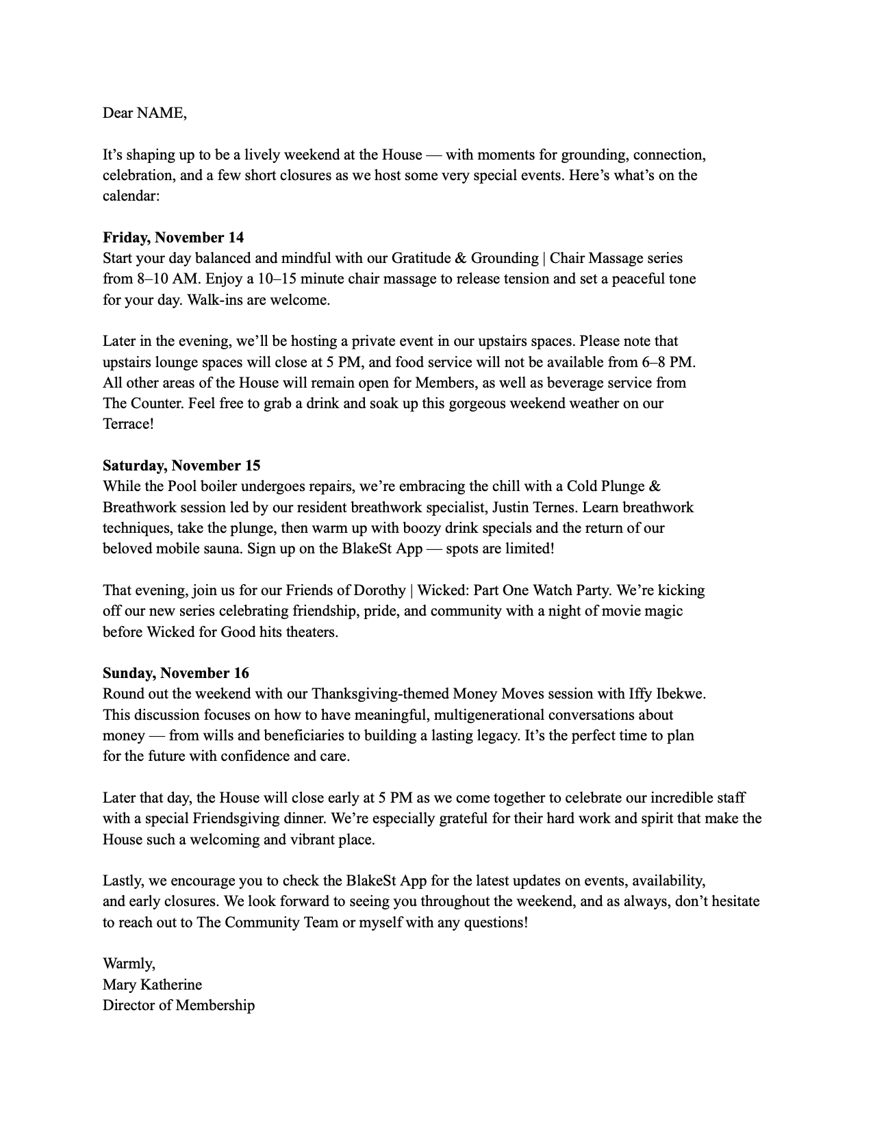 Rather than issuing a routine operational notice, I framed the memo as a leadership-forward communication. The messaging emphasized preparedness, service standards, and appreciation for Member engagement, ensuring the tone felt reassuring and proactive rather than reactive.